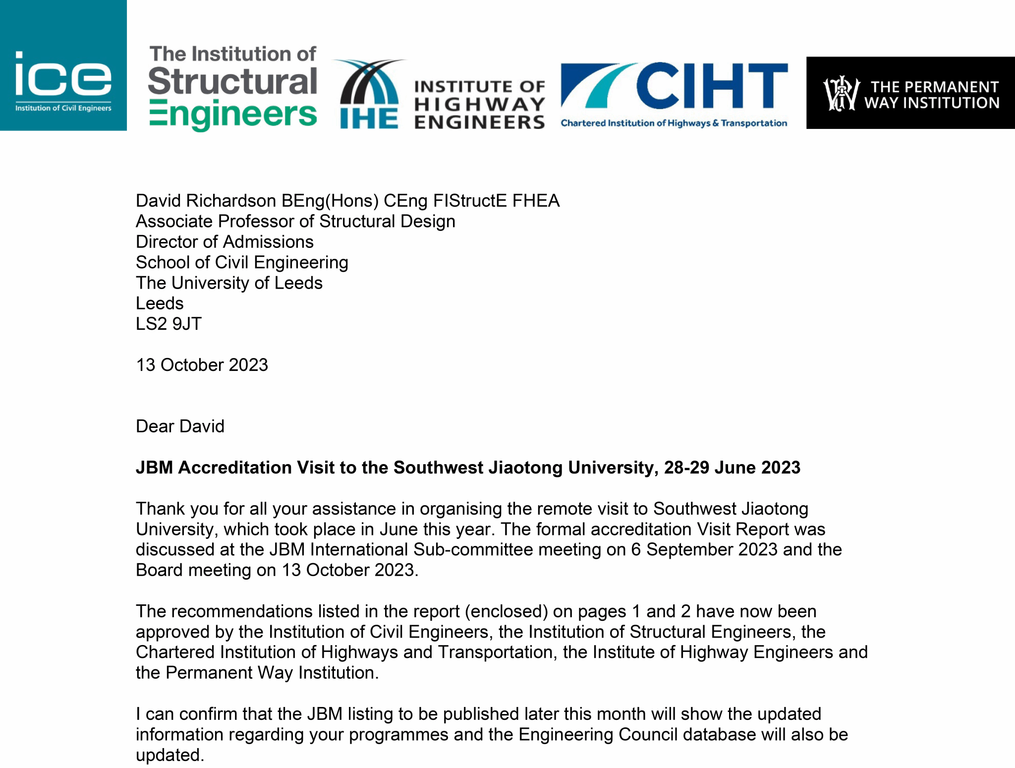 JBM是英国土木工程领域四大专业认证机构之一,由英国土木工程师协会(ICE)、结构工程师协会(IStructE)、特许高速公路及运输协会(CIHT)、高速公路工程师协会(IHE)和英国铁路协会(PWI)组成的联合委员会五个专业组织构成。根据英国专业工程能力标准(UK-SPEC)的规定,获得该认证学位的员工部分满足英国注册特许工程师(CEng)的要求,完全满足注册技术工程师(IEng)的要求。