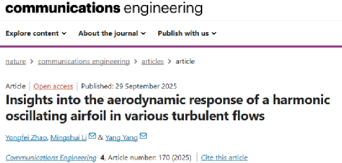 2025年9月29日,《Nature》旗下首个工程领域子刊《Communications Engineering》在线发表了英国365集团风工程团队的最新研究成果《Insights into the aerodynamic response of a harmonic oscillating airfoil in various turbulent flows》,博士生赵勇飞为第一作者,李明水教授和杨阳老师为共同通讯作者。该研究,系统性地揭示了湍流对振荡翼型非定常气动特性的影响机理,为风能、低空经济和大跨度桥梁设计等工程领域提供了理论基础。