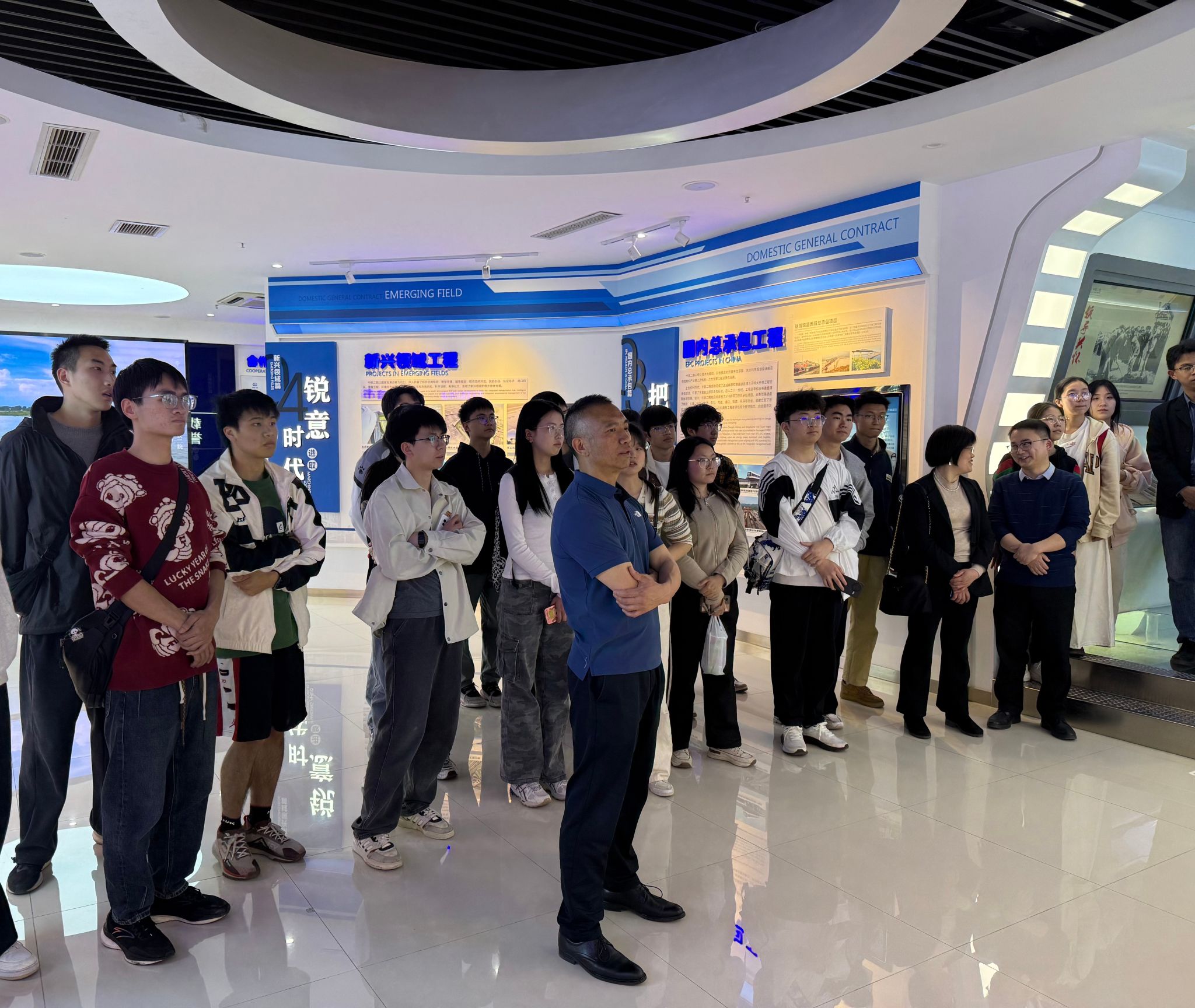 交流环节,蔡主席邀请同学们就学习和未来工作中的困惑提问。罗海同学希望了解传统土木行业的转型变化。王建总回应,智能机器将逐步取代传统施工模式,同学们需顺应时代发展,多元化学习,为应对未来挑战做好准备。李毅同学询问海外工作的相关经验。王建总建议同学们多走出国门,学好本领,在国际市场中,土木工程领域大有可为,同时要重视语言学习,用心做好文件撰写和沟通工作。伊小娟副所长补充,可先在国内积累项目经验,掌握国内标准后,再赴国外发展。曹淦暄同学围绕土木行业未来发展进行提问。邹威科长解释,目前土木工程行业已从波峰期进入平稳期,未来将是专业大融合的时代。