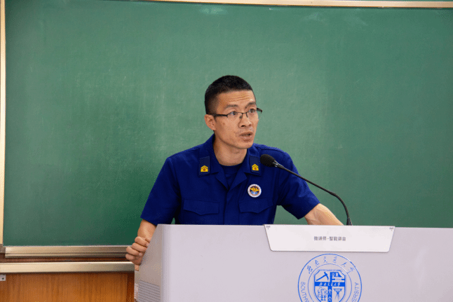而后,郫都区犀浦消防中队陈毅曦班长进行消防逃生安全知识培训。陈班长不仅讲述了火灾的危害性、消防“四懂四会”,还详细解读了火灾逃生“三要”、“三不要”,进一步增强了师生的消防意识。