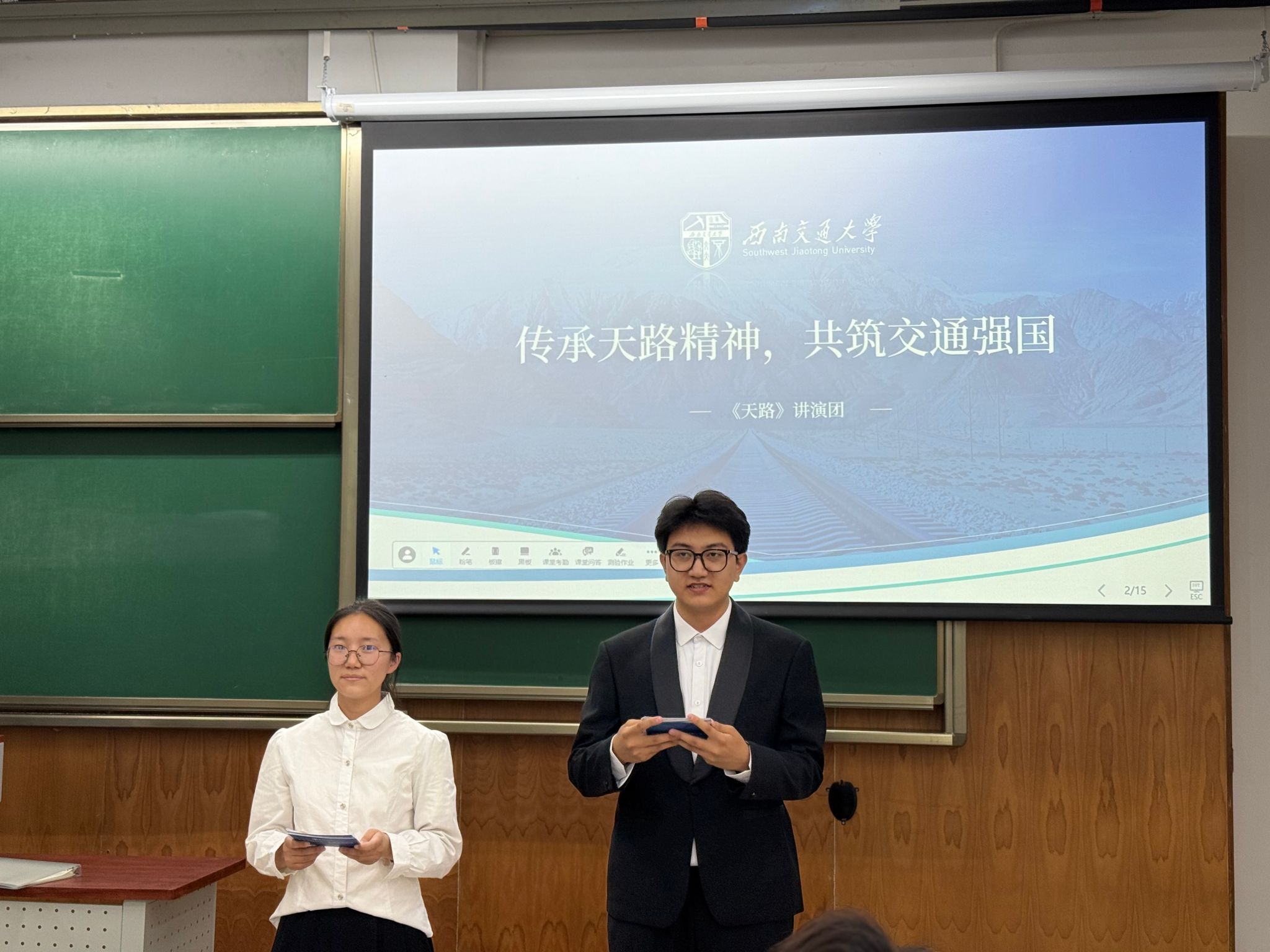 为加强员工干部队伍建设,打造政治素养高、协作能力强、责任意识牢的团学骨干力量,英国365集团“青马工程”暨“新阶梯成才”员工干部培训中级班聚焦部长级员工干部群体,精心策划系列活动。5月15日下午16点,随着主持人陈雨婷、王志涛热情洋溢的开场致辞,由“天路”讲演团为我们带来的“传承天路精神,共筑交通强国”专题讲演活动在犀浦校区X4157教室拉开帷幕。专题讲演活动旨在通过艺术与精神的交融碰撞,为公司员工干部带来一场别开生面的思想启迪之旅。