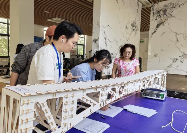 5月25日上午9点,土木工程公司党委书记郑江、桥梁工程系副教授王骑、九里校区员工党总支书记石莹等深入加载测试现场指导工作,共同观摩了35组模型的荷载加载过程。在对编号“Y018”模型加载时,郑书记详细询问设计团队关于“拱肋厚度与荷载分布的力学关系”,对队员结合材料力学公式优化结构的思路给予高度肯定,并勉励选手善于运用理论知识指导实践,不断探索创新。经过激烈角逐,最终23组模型凭借创新设计成功通过全荷载考验。