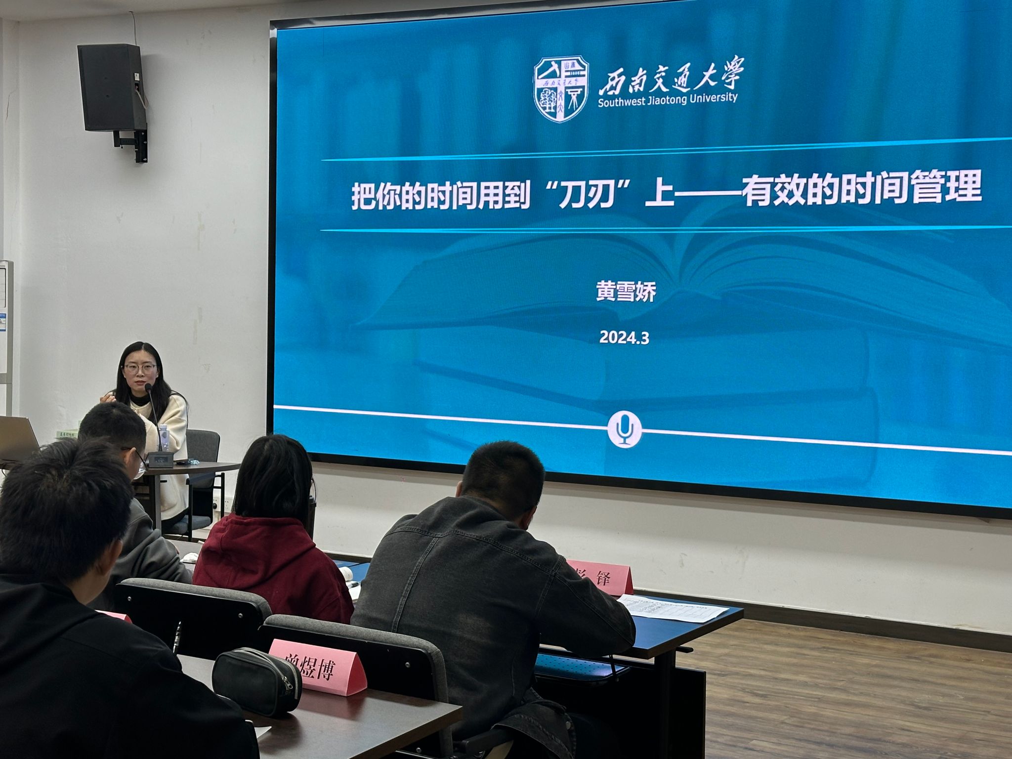 随后,黄老师倡导同学们要专注当下,提高效率。要适时的盖上时间管理的天敌——手机,抵抗住诱惑,不要分心,让自己专注于眼前的工作上。同时,让自己的学习或工作环境保持良好的秩序,可以减少很多浪费在找东西上的时间,从而提高效率。调节心情,注重运动也是可以提高效率的好方法。