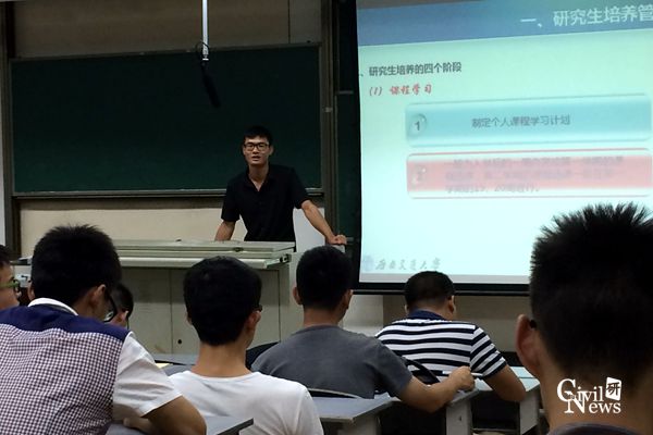 为了让2017级研究生新生对公司和公司有一个更深入的了解,尽快地适应交大的研究生生活。9月7日晚上19:00,研究生辅导员叶礼宁、吴琴在逸夫馆4323为同学们作了题为“研究生日常教育管理专题”的讲座。