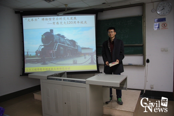 接着,支部书记陈代秀以PPT的形式,为大家讲述了“火车头”博物馆的基本情况。通过介绍使大家了解到,博物馆1期有5辆机车车头,分别是犀浦校区南门轨道上的一辆蒸汽机车和两辆才安放好的内燃机车、电力机车;停放在公司第四教学楼大厅里的米轨列车;停放在九里校区教育部磁悬浮重点实验室的磁悬浮列车。同时,陈代秀同学还从5辆机车出发,引出交大与中国铁路发展的密切关系。