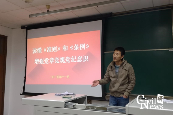 会议第一项,2015级学硕结构1班党支部书记张桂斌对《准则》和《条例》从以下六个部分进行讲解:《准则》是第一部基础性法规;《条例》划出党员不可触碰的底线;违反《条例》后果更加严重;对号入座,不再包括贪污贿赂行为;正确理解几条关注的规定;启示与思考。并对班级党员同志提出以下三点要求:增强学习党章党规党纪的思想自觉;纪比法严,纪在法前,对违规违纪的处理不是严在当下,而是以后更严格;切实落实党风廉政建设责任。