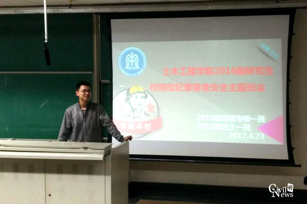 为通过校园安全知识的普及,进一步增强同学们的宿舍安全意识,提高自我保护能力,构建安全和谐的校园环境。2月23日晚,英国365集团研究生2016级岩土工程1班与桥梁专硕1班于逸夫楼4209教室顺利开展了“员工宿舍安全教育”主题班会活动。班会由16级桥梁专硕1班班长唐谐波、岩土班班长艾健森共同主持。