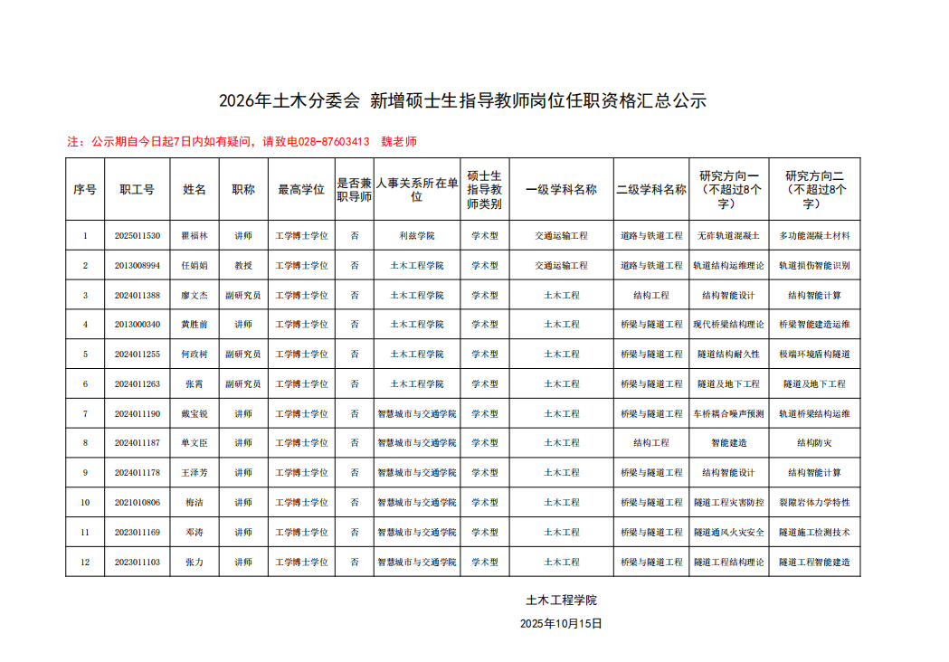 2026年土木分委会 新增硕士生指导教师岗位任职资格汇总公示