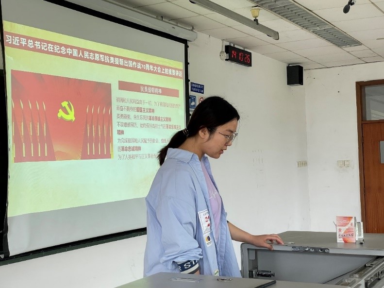 活动伊始,全体起立奏唱国歌。随后党支部宣传委员张童童向大家介绍伟大的抗美援朝精神。抗美援朝精神是为了祖国和民族的尊严而奋不顾身的爱国主义与精神,是英勇顽强、舍生忘死的革命英雄主义精神,是不畏艰难困苦、始终保持高昂士气的革命乐观主义精神,是为了完成祖国和人民赋予的使命、慷慨奉献自己一切的革命忠诚精神,也是为了人类和平与正义事业而奋斗的国际主义精神。