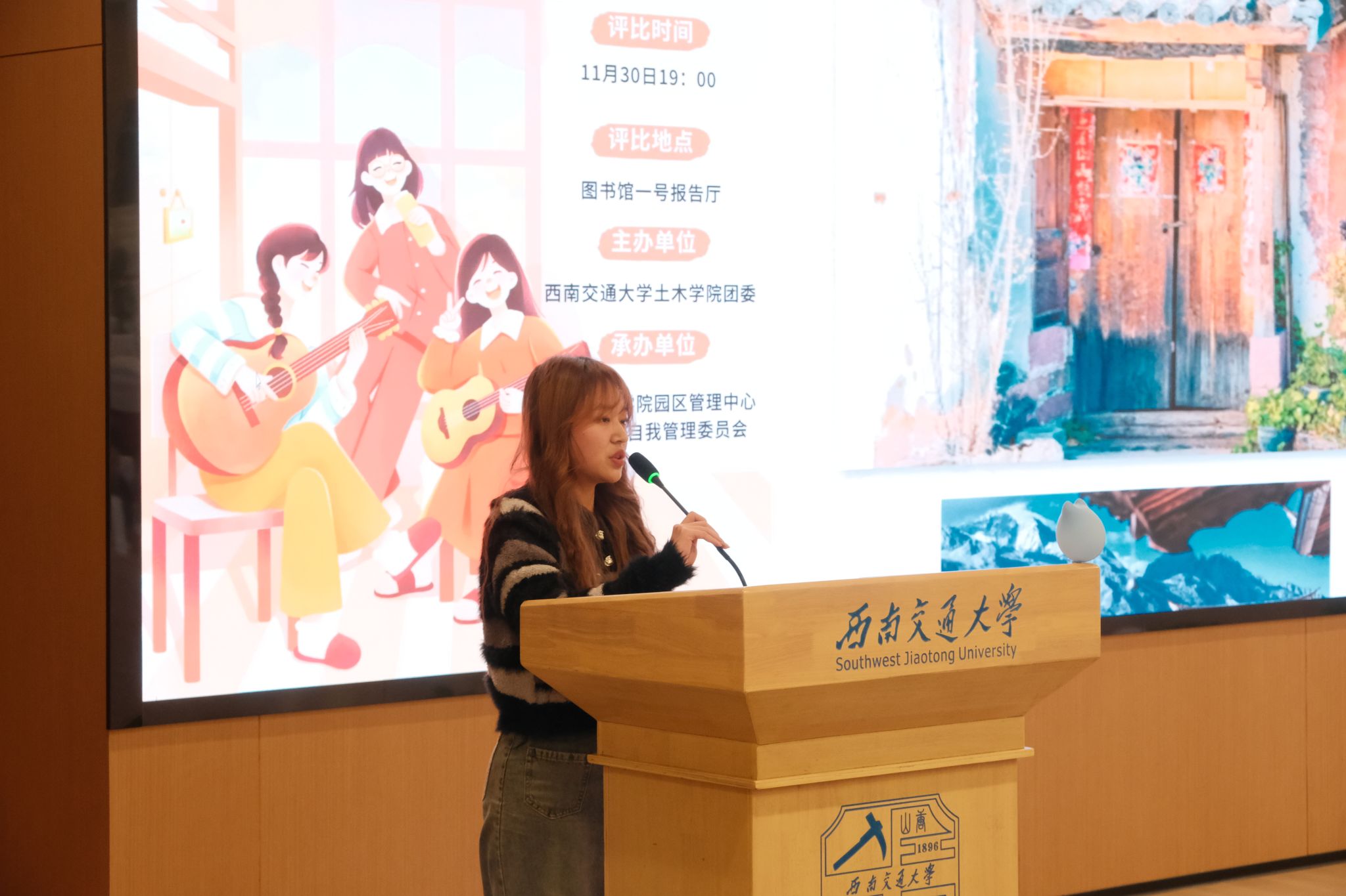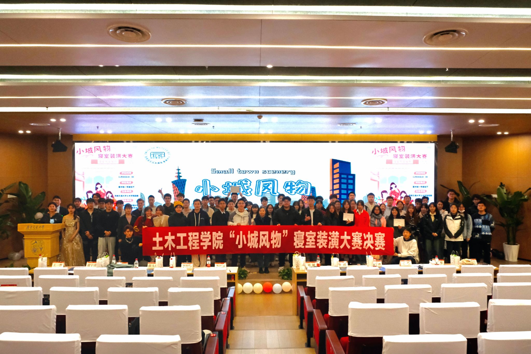 为了继承和发扬中华优秀传统文化,将一些极具特色的小城拉近人们的生活,本次寝室装潢以小城风物为主题,在精彩的开场配音表演之后,两位主持人正式拉开了大赛的帷幕。经过激烈的初赛角逐,共有八间寝室入围本次决赛。所有寝室依次上台介绍自己寝室的装潢情况并进行一系列的风采展示,由嘉宾们共同评分,选出装饰最为精美、气氛最为融洽的优胜寝室。比赛过程中设有抽奖环节和精彩的节目,都为本次决赛增添了一份趣味。