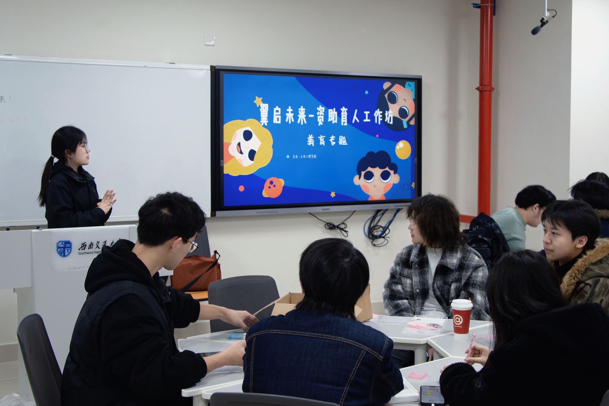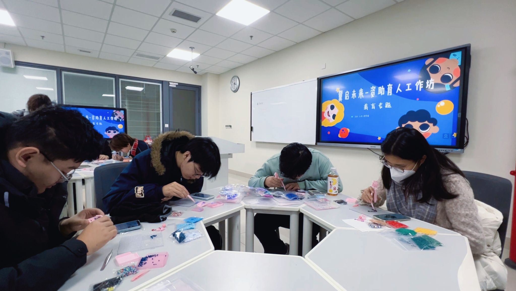 本次活动以趣味十足的“拼豆创作”为美育实践载体,通过手工创作的沉浸式体验,引导受助员工在动手实践中发现美、创造美、感悟美。活动伊始,工作坊指导老师贾璇琦主持开场并阐明活动主旨。她表示,资助育人不仅要为员工提供物质保障,更要关注其精神成长与全面发展,本次美育主题活动正是基于这一理念开展,希望同学们能暂时放下学业压力与电子设备,全身心投入手工创作的乐趣中,在色彩搭配与造型设计中激活审美感知,在专注实践中锤炼耐心与匠心,同时在互动交流中增进同学情谊,让美育滋养心灵、赋能成长。