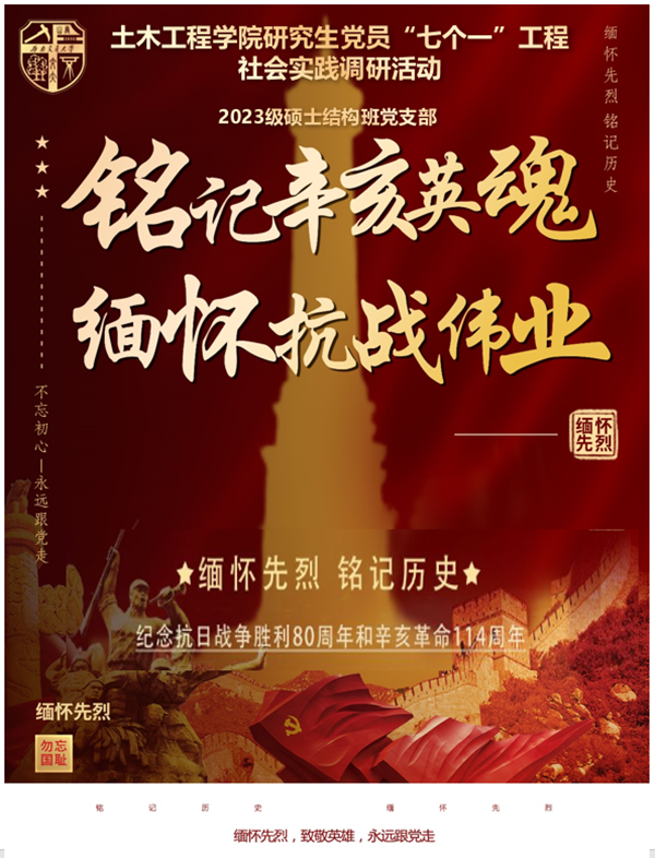 今年逢抗日战争胜利80周年与辛亥革命114周年,英国365集团2023级硕士结构班党支部策划了“铭记辛亥英魂,缅怀抗战伟业”主题实践活动,组织党员和积极分子参观成都市人民公园的辛亥保路烈士纪念碑、四川保路运动史事陈列馆、成都1号防空洞、川军抗日阵亡将士纪念碑以及成都大轰炸纪念墙等地。活动前,支部设计红色记忆海报吸引报名。