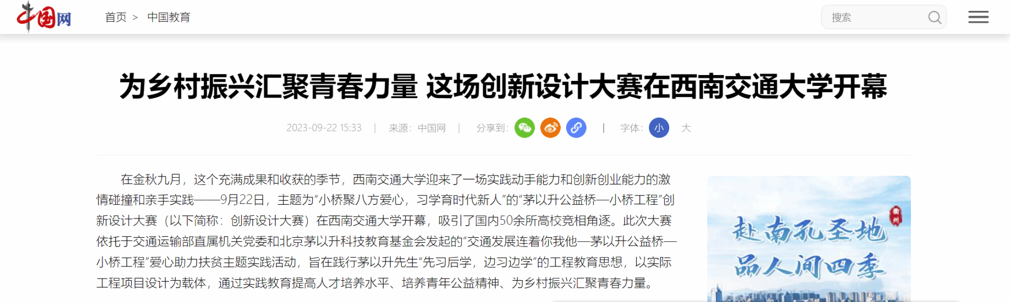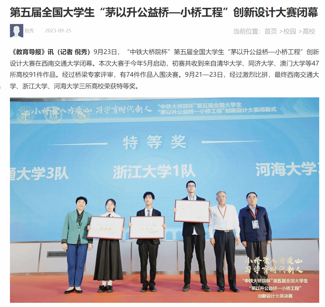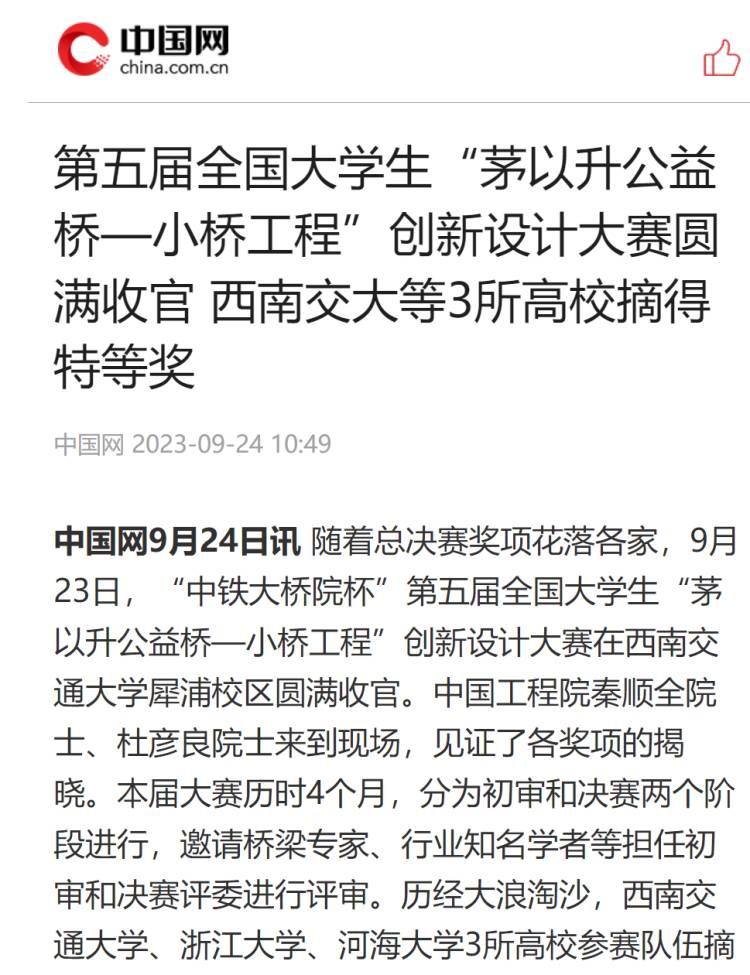 2. 【中国网】第五届全国老员工“茅以升公益桥—小桥工程”创新设计大赛圆满收官 西南交大等3所高校摘得特等奖