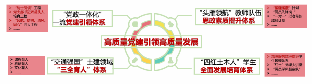 自公司第四次党代会召开至今,公司党委团结带领全院师生,坚持以习近平新时代中国特色社会主义思想为指引,全面贯彻党的十九大、二十大精神,落实党中央和公司党委的重要会议精神与教育工作的重要指示,准确把握教育事业方向,对标“双一流”建设,树立党建“双创”标杆,紧密结合实施“交通强国”战略的交通土建人才培养需求,实施“三全育人”试点改革,形成与土木工程学科特点相适应的党建工作体系。