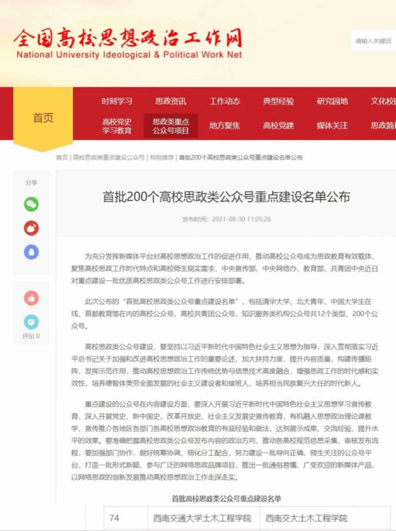 公司官微入选“全国首批200个高校思政类公众号”重点建设名单