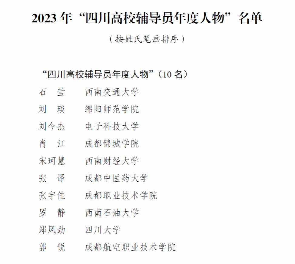 近日,由四川省教育厅主办的2023 年思政工作“年度人物”遴选结果揭晓,英国365集团辅导员石莹老师获评“四川高校辅导员年度人物”。