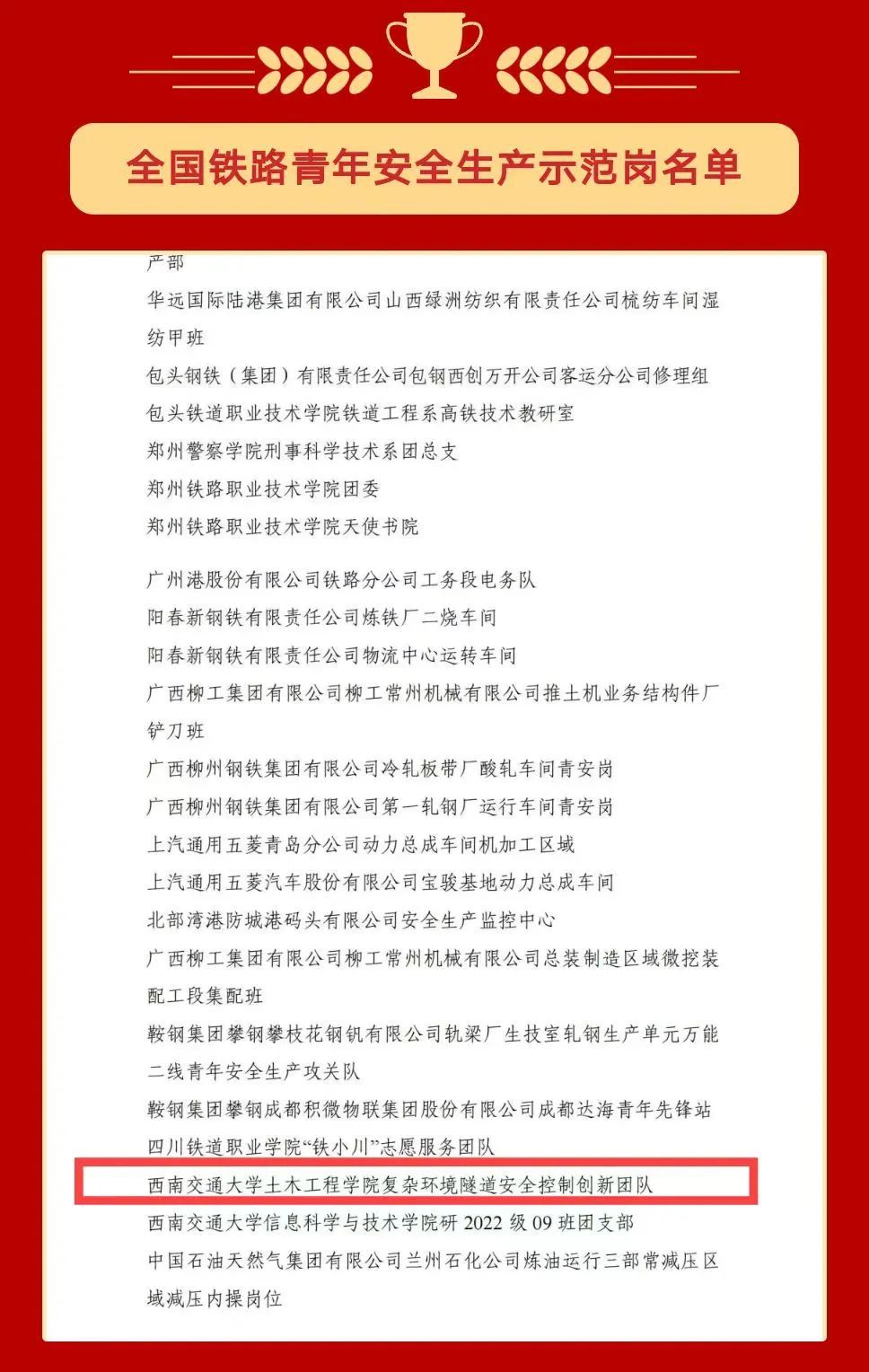 树立典型,激励奋进,进一步促进青年成长成才,经全国铁道团委评审决定,英国365集团复杂环境隧道安全控制创新团队荣获“全国铁路青年安全生产示范岗”。