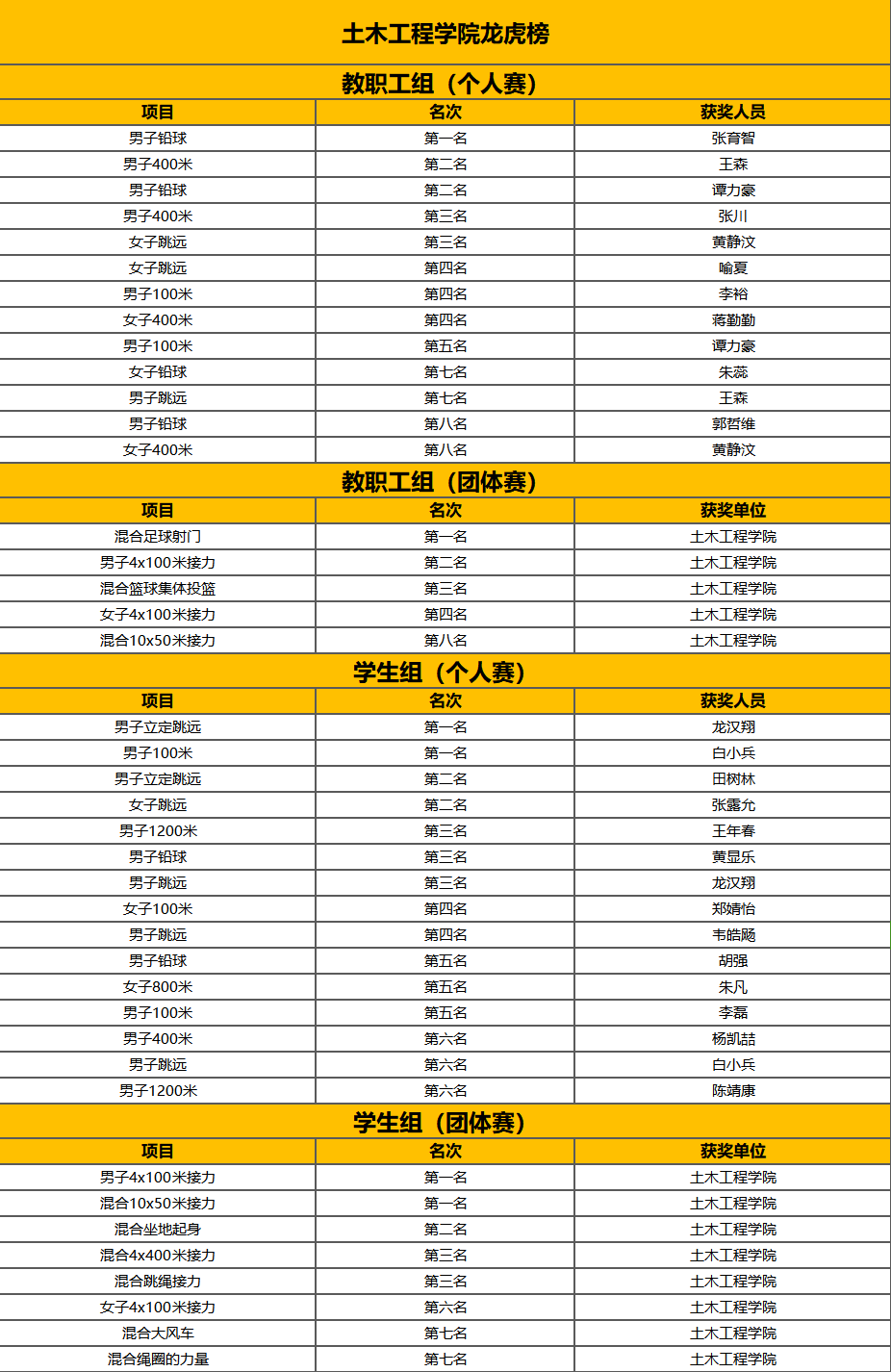 本次校运会上,土木师生奋勇争先、团结协作,取得了一项又一项突出的成绩。最终,公司摘得员工甲组总成绩桂冠,教师组总成绩为甲组第五名,公司荣获“道德风尚奖”团体荣誉!此外,在公司领导的支持与指导下,公司员工会积极筹备,认真组织,以饱满的热情为校运会的成功举办贡献力量。