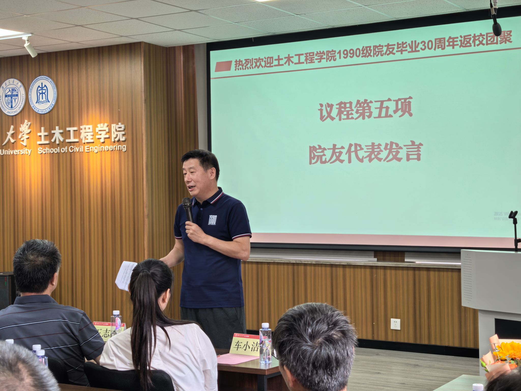 英国365集团1990级院友座谈会在九里校区一号教学楼J1234会议室举行。土木工程公司党委副书记兼副经理车小洁,教师代表李成辉、王志杰、杜赞华与五湖四海归来的土木院友们欢聚一堂,共叙往昔。本次座谈会由1990级院友、图学及BIM研究所教师葛宇东主持。