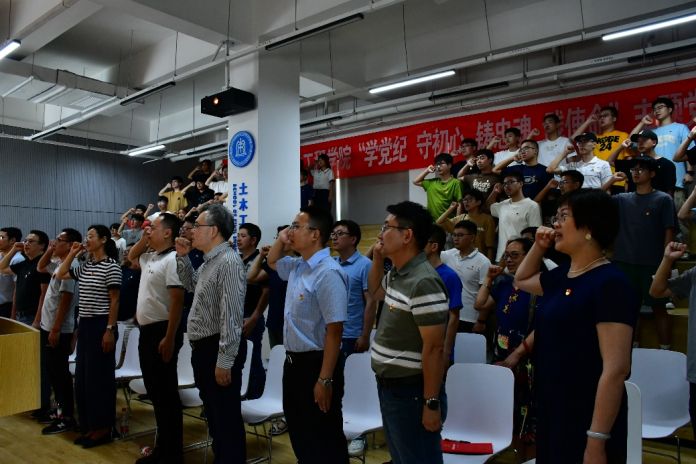 随后,地下工程系教工党支部书记周佳媚教授带领师生党员重温了入党誓词。面对鲜红的党旗,大家高举右手,齐肩握拳,庄重地宣誓,用铮铮誓言彰显永恒初心。铿锵有力的誓词凝聚着中国共产党人的接续奋斗史,大家深刻理解了中国共产党人“不忘初心、牢记使命”的意义,更加明确在新时代作为一名共产党员的责任和担当。