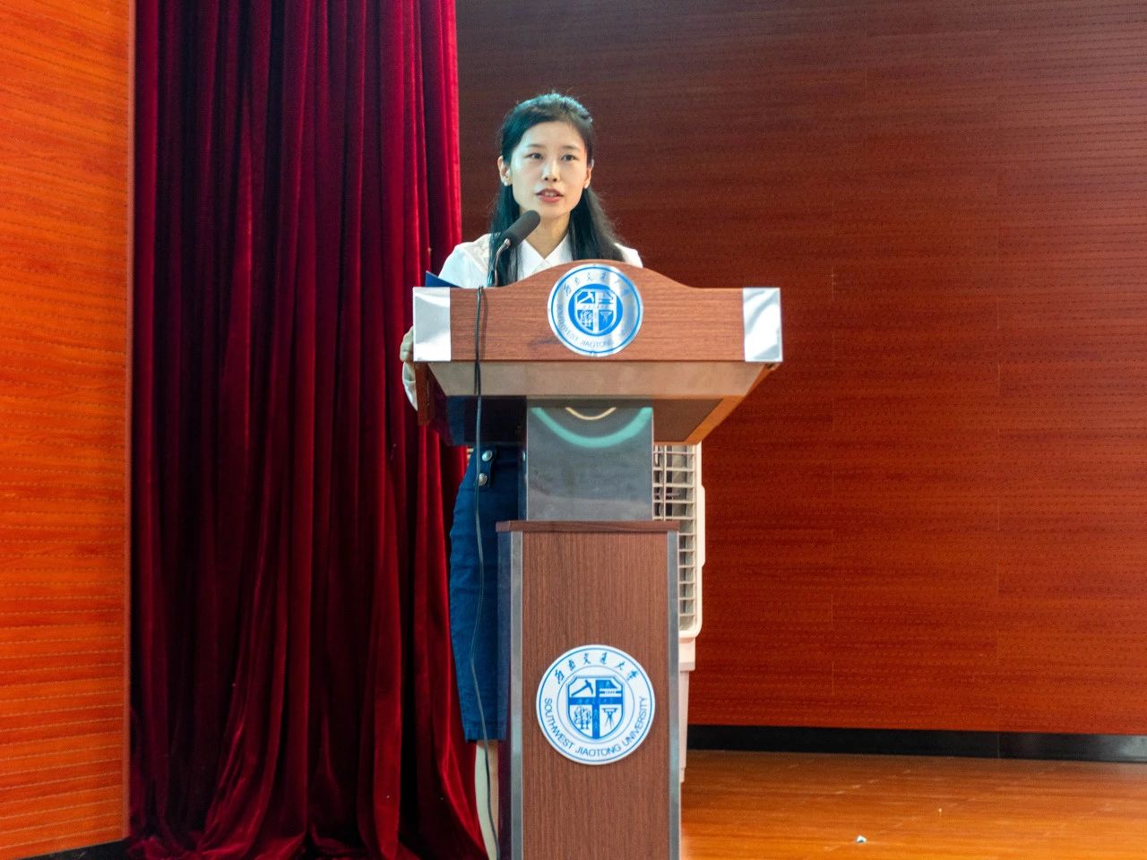 在全场热烈的掌声中,公司领导为新生代表佩戴院徽。