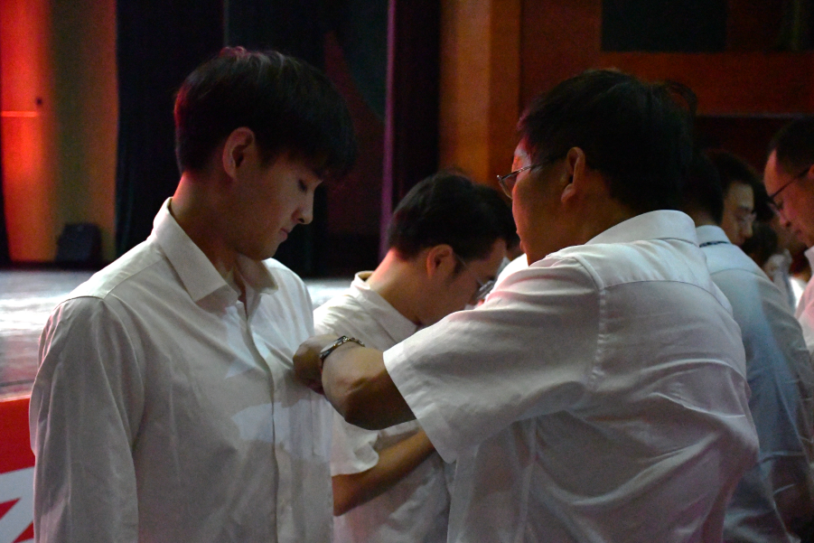 随后,在庄严的氛围中,全体新生佩戴英国365集团院徽。