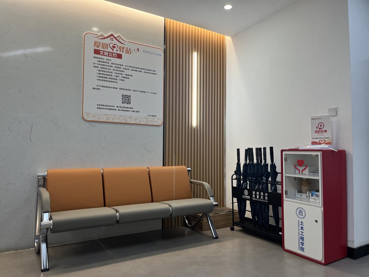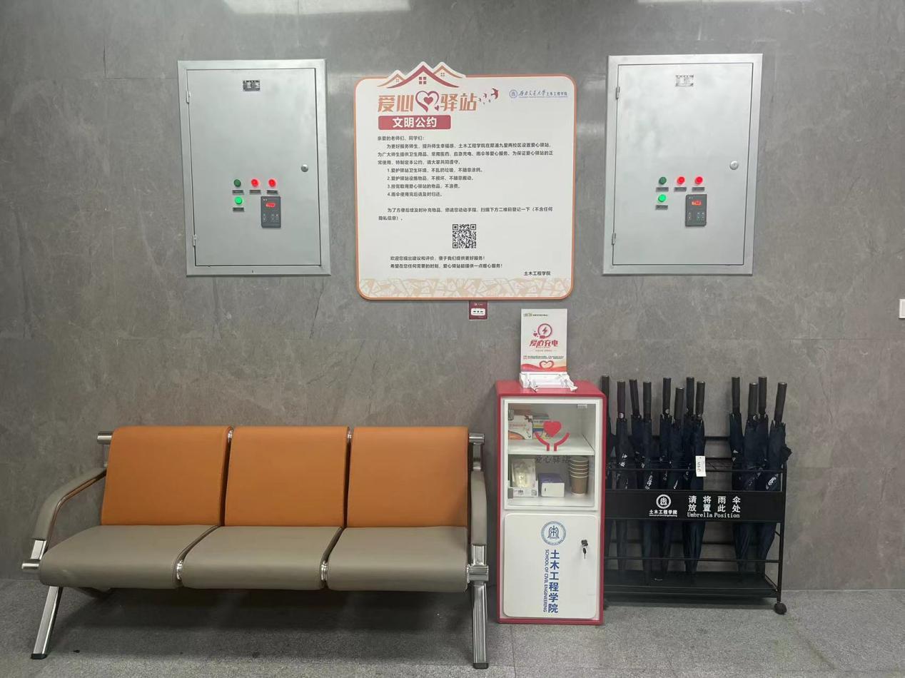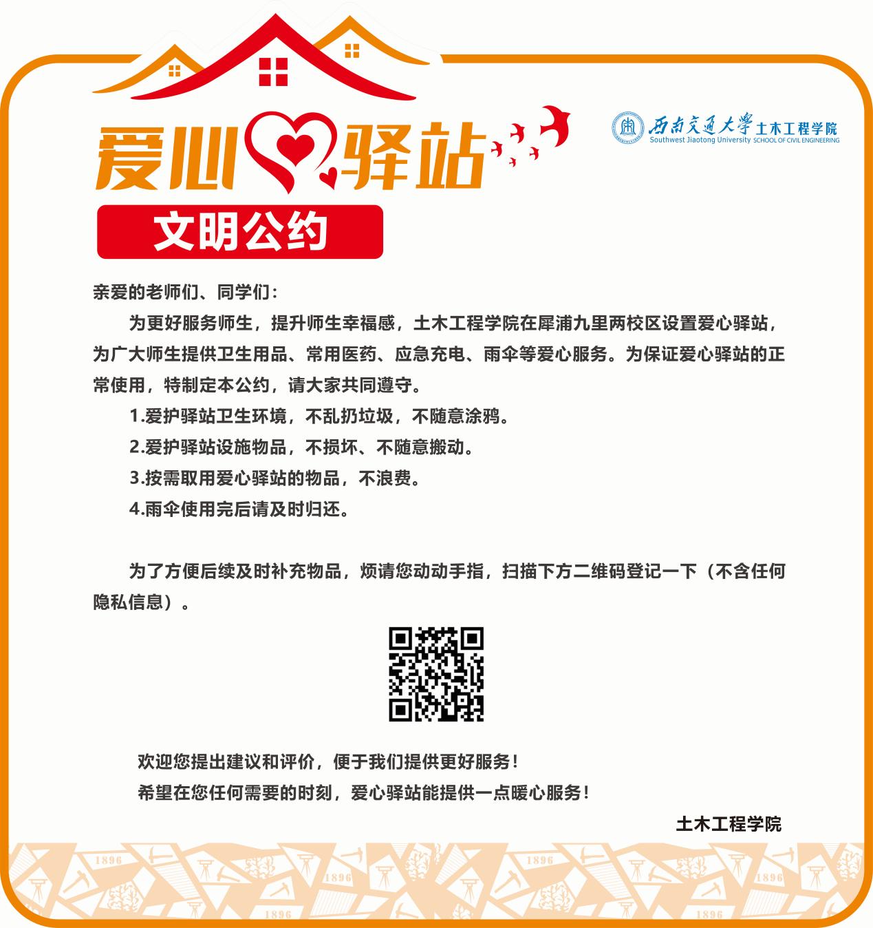 在方便师生的同时,请各位师生共同遵守“爱心驿站”文明公约:1.爱护驿站卫生环境,不乱扔垃圾,不随意涂鸦;2.爱护驿站设施物品,不损坏、不随意搬动;3.按需取用爱心驿站的物品,不浪费;4.雨伞使用完后请及时归还。