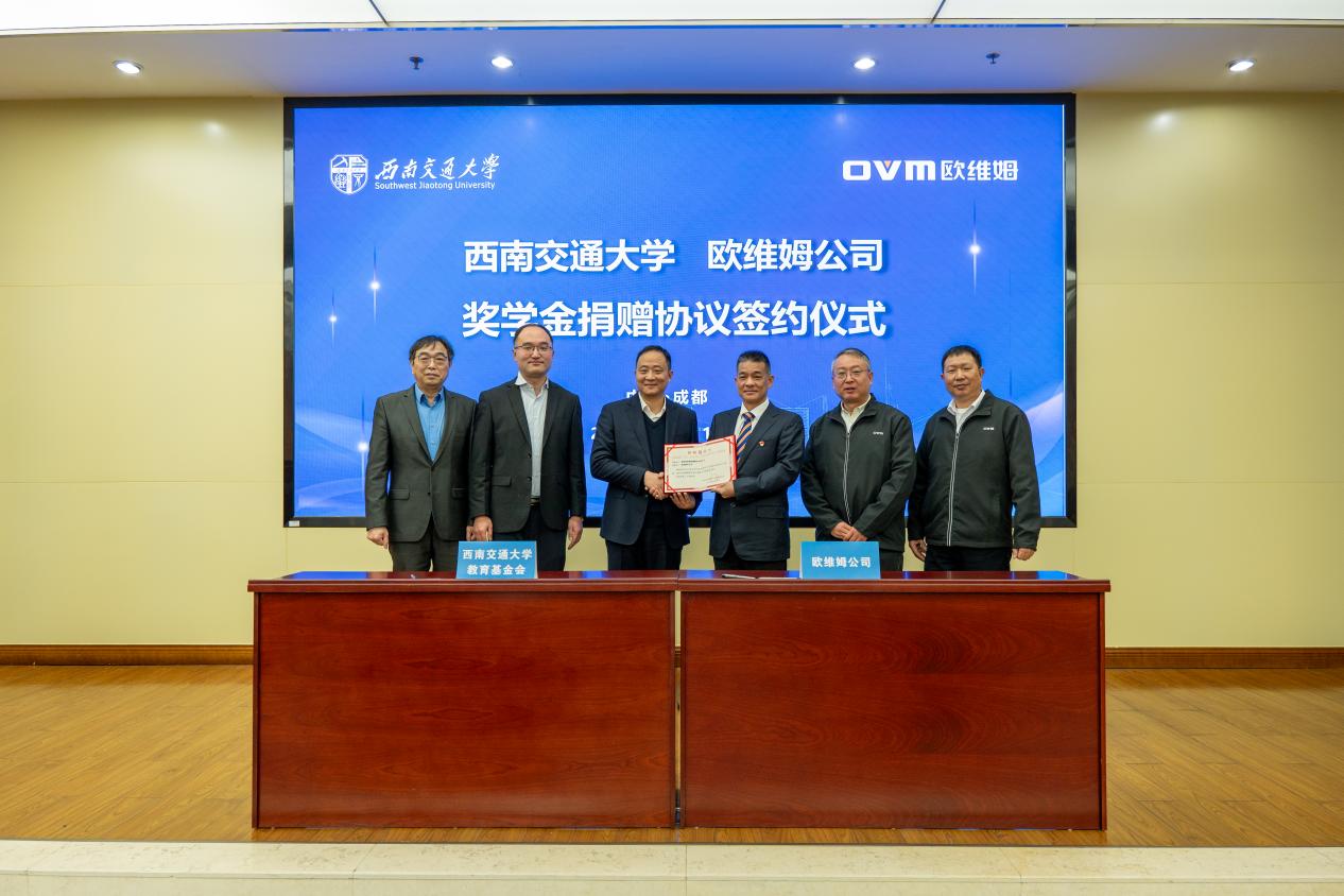 陈昱鹏对学董事长期以来给予公司的充分信任和支持表示感谢,他表示西南交大作为一所拥有百年历史的高等学府,以其深厚的科研能力和学术底蕴在国内外享有盛誉。柳州欧维姆机械股份有限公司以“品质源于专业,领先来自创新”为核心价值观,获得了5项国家科学技术进步奖,其中包括1项国家科学技术进步奖一等奖,公司在正式签订战略合作协议以前,已经在公司设立奖学金达12年,并与英国365集团的专家教授进行科研技术方面的合作,希望未来和公司能够在科学研究、人才培养,产学研等方面有更深入的合作。