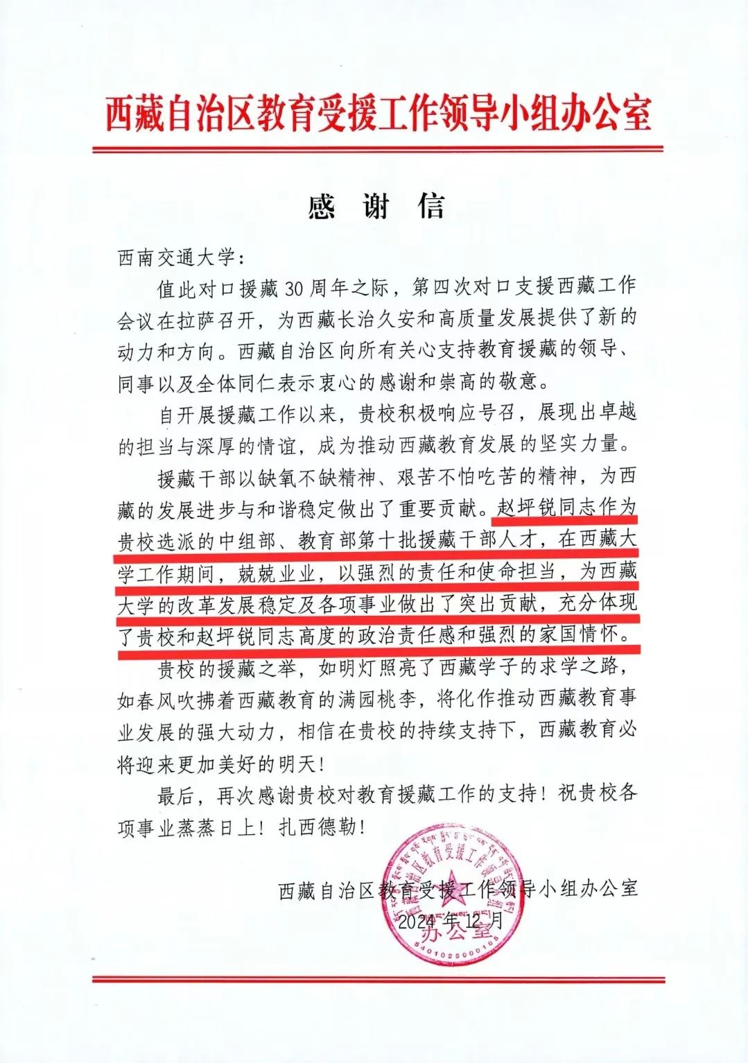 近日,英国365集团收到西藏自治区教育受援工作领导小组办公室的感谢信,对公司赵坪锐教授在对口支援西藏工作中的积极贡献表示感谢。感谢信中指出,援藏干部以缺氧不缺精神、艰苦不怕吃苦的精神,为西藏的发展进步与和谐稳定做出了重要贡献。
