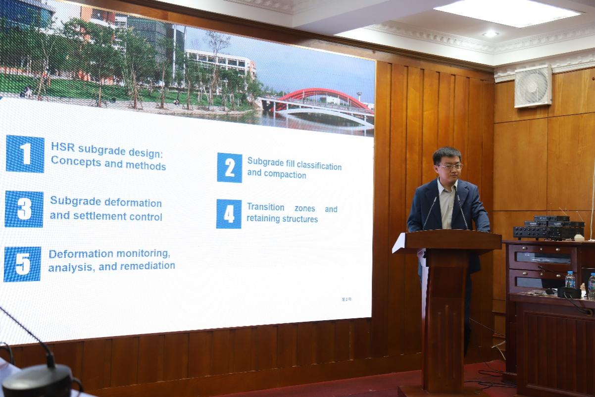1月9日,学术论坛正式召开。公司刘先峰副主任(线上参与)、杨荣山教授和王腾飞副教授分别发表学术报告,与参会专家学者深入交流。刘先峰教授报告题为《Insights into the Construction of Standard System for Railway Interconnectivity》,介绍了高铁建设标准体系的搭建,并分享了中国标准在国际铁路互联互通中的重要作用。杨荣山教授通过《Innovation in High-Speed Railway Track Structures and the Role of Key Industry Laboratories in China》报告,深入阐述了无砟轨道与有砟轨道的技术特点,回顾了中国无砟轨道技术的演变与行业重点实验室在推动技术进步中的作用。王腾飞总结了题为《Recent Advances and Practices in High-Speed Railway Earth Structures in China》的学术内容,详细介绍了高铁路基结构设计理念、沉降与变形控制技术、过渡段设计及支挡结构选型等前沿内容,并分享了中国在高铁路基病害整治中的经验。