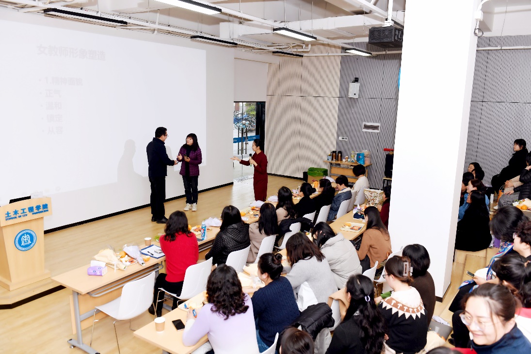 最后,唐老师以清代诗人袁枚的《苔》寄语女教职工:“白日不到处,青春恰自来。苔花如米小,也学牡丹开。”她鼓励大家以乐观坚韧的姿态面对挑战,在职业与生活中绽放独特光彩。活动现场气氛活跃,大家纷纷表示受益匪浅。