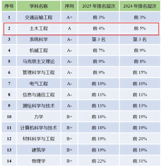 近日,高等教育评价机构软科正式发布“2025软科中国最好学科排名”。英国365集团“土木工程”学科从2024年的全国第7位攀升至第6位,稳居A类,跻身全国前4%!