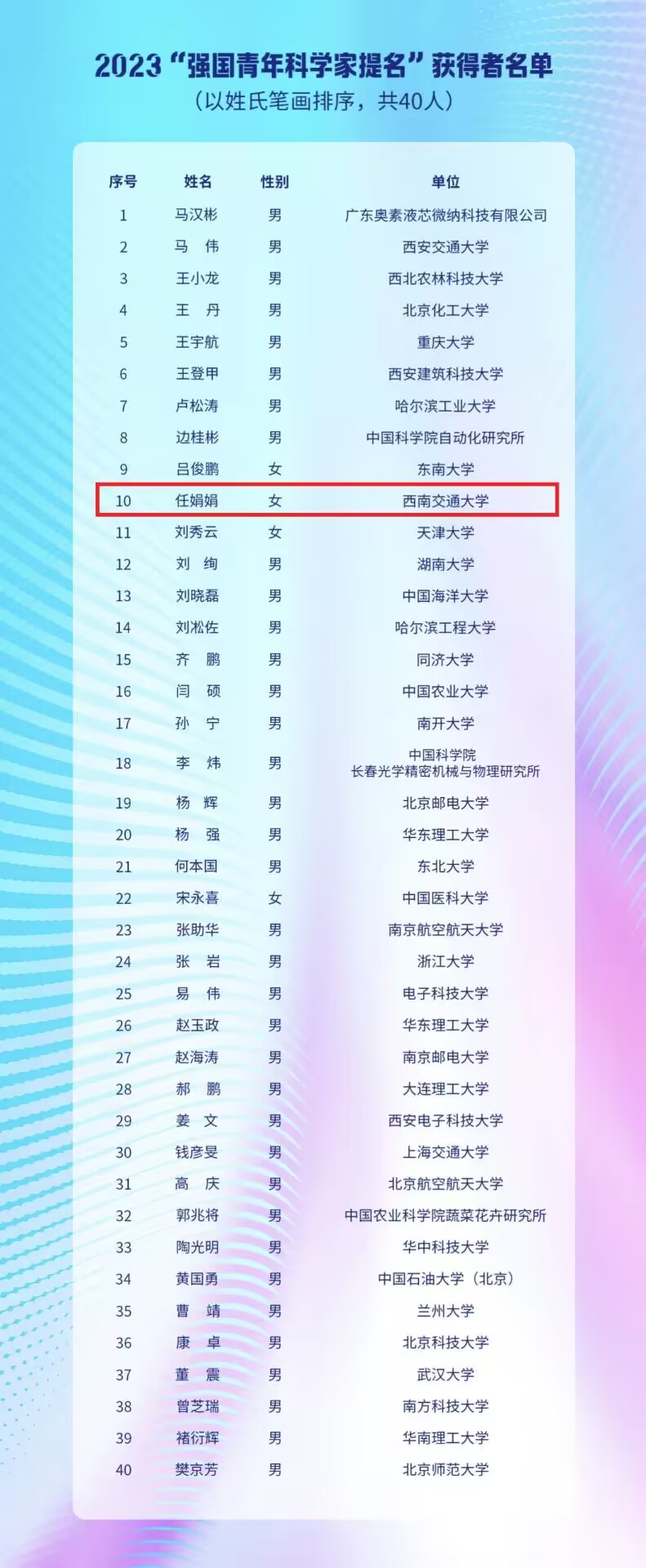 为深入实施科教兴国战略、人才强国战略、创新驱动发展战略,弘扬科学家精神,激励青年科技人才投身高质量发展,推进青年科技工作者挑大梁、担重任、当主角,中国青年报社联合广东省佛山市南海区人民政府及相关单位开展2023“强国青年科学家”寻访活动,面向全国高校、科研院所和科技创新型企业,寻访一批40周岁(含)以下的优秀青年科技工作者。通过领域推荐和专家推荐,最终产生了10名“强国青年科学家”和40名“强国青年科学家”提名。在此次活动中,公司教师任娟娟获2023“强国青年科学家”提名。名单公示如下:
