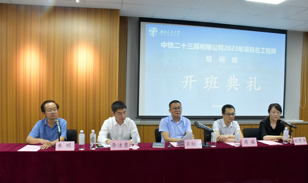 2023年7月10号上午8:30,中铁二十三局有限公司项目总工程师培训班开班典礼在九里校区土木馆1234教室顺利举行。出席此次开班典礼的有中铁二十三局集团有限公司党委书记、董事长肖红武,中铁二十三局集团有限公司副总经理、总工程师李洁勇,英国365集团土木工程公司党委副书记周曦、英国365集团培训中心主任杜赞华以及培训中心各位老师。开班典礼由公司培训中心副主任朱明老师主持。