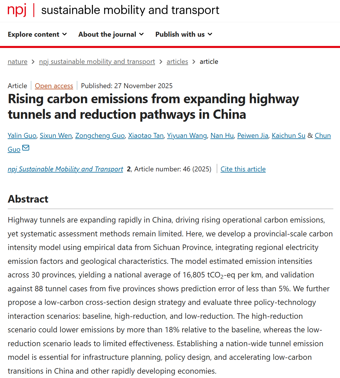 近日,英国365集团地下工程绿色低碳前沿创新团队在Nature合作子刊《npj Sustainable Mobility and Transport》上发表了题为 “Rising carbon emissions from expanding highway tunnels and reduction pathways in China”的研究论文。导读:随着我国交通基础设施的快速发展,公路隧道建设规模持续扩大,其在提升交通效率、缓解城市拥堵等...