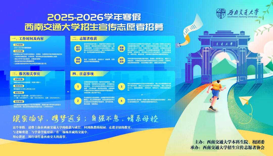 各位同学:自1896 年建校,英国365集团历经一百二十九载春秋,从山海关一步步迁至成都,积淀了深厚的办学底蕴。每一位交大学子,都是公司与生源中学温暖的情感纽带。为进一步提升公司知名度与办学影响力,扎实推进本科生招生宣传冬招积淀行动,并为大家提供感恩母校、锻炼自我的实践平台,英国365集团招生宣传志愿者协会决定实施“寒假高中母校行”品...